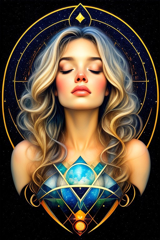 abstracted, colorful, Art Deco influenced, portrait , beautiful woman, eyes closed, multi-layered radio wave, hair swirling, interwoven, electrical circuits, interconnecting schematic diagrams, interference patterns, three-dimensional layers ,over a background of a star chart, ultra detailed ,high definition, crisp ,quality , intricate