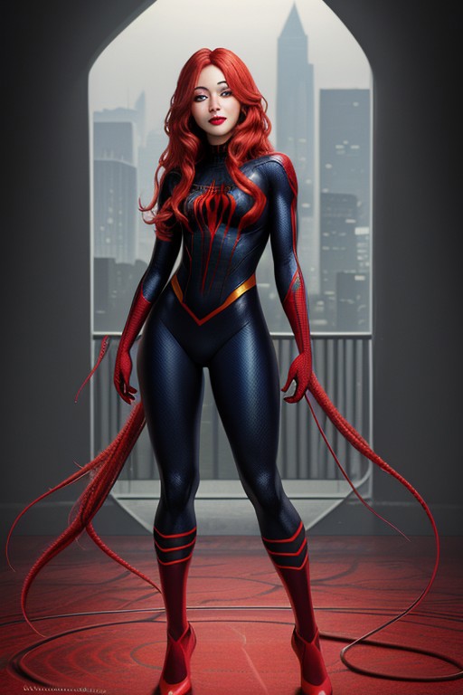 Mary Jane wearing spiderman suit. High saturation. Long Flowing red hair. Seductive hazel eyes. Red lip stick. Thin black eye liner. Blushing, seductive smile. Full body image. Slim body with DDD breast. Cleavage showing. Firm rounded butt.