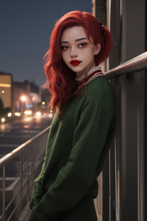 Mary Jane. Flowing red hair in pig tails. High saturation. Deep green eyes. Moonlight over city background. Red glowing lip stick. Lip piercing. Black eye liner. Light freckles with cherry red blush. Seductive smirk. Head tilted to side. Sexy body physique with large breast, showing cleavage. Wearing spiderman outfit.