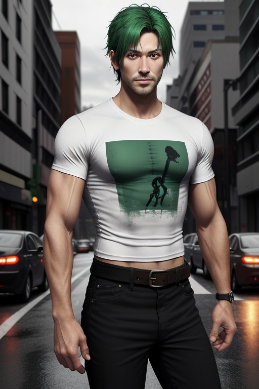 1boy, young male focus, asian look, anime style, tall body, small hips, small waste, young boy, 19 years old, long face, short hair, green hair, blue eyes, open eyes, wet crop t-shirt, muscular belly, graphic t-shirt, punk t-shirt, digital illustration, t-shirt in orange and white, looking at viewer, cowboy style, busy city street, belt, black pants, atmospheric lighting, midriff peek, night, blurry, best quality, amazing quality, best aesthetic, absurdres, wet t-shirt, lifting t-shirt with one hand