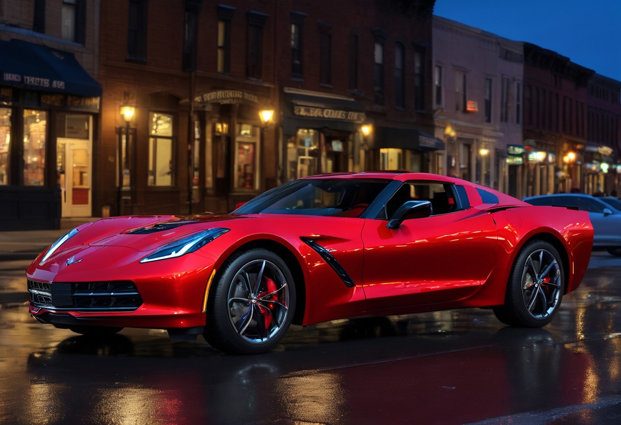 2023 corvette stingray with spiderman paints job, head lights on, city streetlamps, nighttime, Glowing moon background, deep rich, glossy colors, High Resolution HDR, 8K