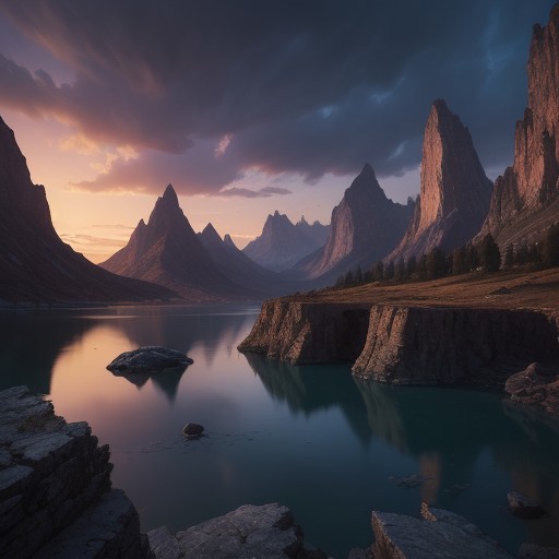 Landscape. The lake, stones, rocks, mountains, high detail, vibrant colors, fantasy, epic realistic, complex background, Magical fantasy scenes, glowing light sources, fluid color transitions. Epic landscape, desolate atmosphere, photorealistic, masterpiece, 64k, UHD, ultra detailed, vivid colors, high quality, sharp focus