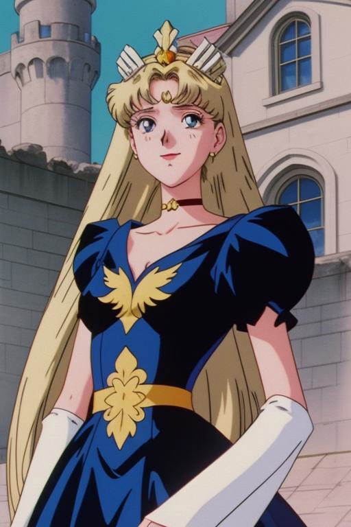 Princess serenity in black dress, relaxed posing, soft smile, gothic castle, floral motif, blonde hair, blue eyes, fancy crown, EPTakeuchiNaokoStyle, 1990s \(style\), anime screencap, retro artstyle, anime coloring, traditional media