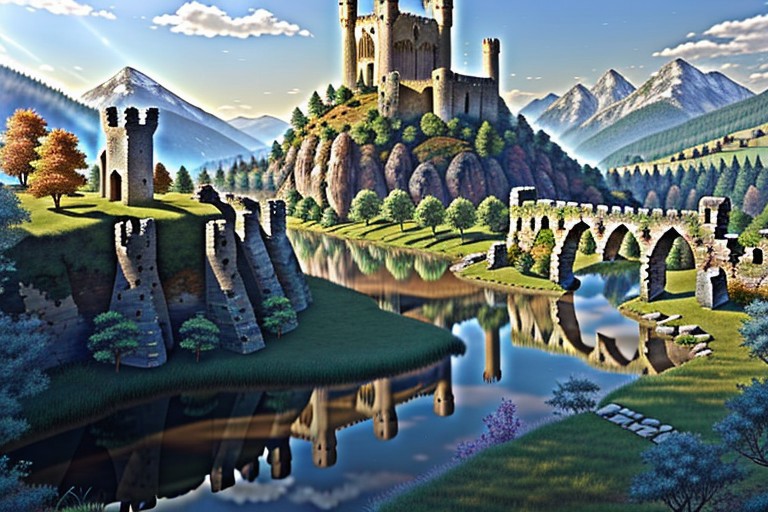 An expansive heroic fantasy valley, (immense in scale:1.5), (completely enclosed:1.5) by a mountains, moutains around the valley, Lush green forests with tall trees and vibrant grass fill the valley floor; At the center of the valley, a medieval castle with intricate stone architecture blends subtly into the landscape, Scattered throughout the valley, (tall mysterious towers:1.2) rise above the forest canopy, with ancient (stone ruins:1.2) and crumbling structures hidden among the foliage, A wide, winding river flows through the valley, joined by tranquil lakes that reflect the sunlight, The scene is bathed in warm, golden hour sunlight, with clear skies and soft shadows, creating an immersive, bright summer day atmosphere, Photorealistic textures, detailed rock formations, flowing water reflections, and intricate stonework. Vast open sky with soft clouds,