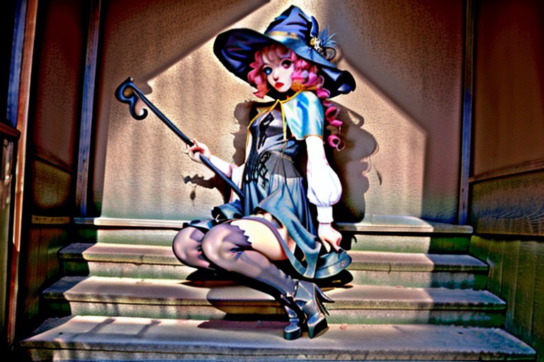 solo girl, mouse ears, mouse tail, flat chest, short, posing, multi-colored hair, happy to see you, striped thigh-high socks, high heels, gothic dress, looking at the viewer, witch hat, gothic world,