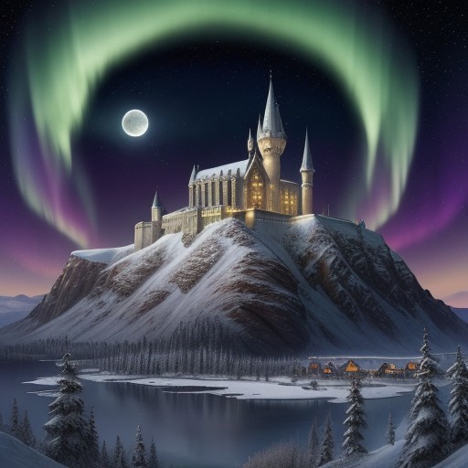 Hogwarts castle on mountain top, hilltop, Hogwarts school, night, moon, glowing, snow, winter, full moon, moonlight, snowing, colors, colorful, psychedelic colors, psychedelic, stars, northern lights, aurora borealis, forest, lake