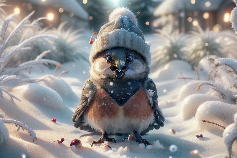 A happy cute, (robin:1.2), (bird), (wearing a winter hat), Adorable, heart warming, cheerful, detailed, bright colours, friendly expression, small size, shiny, eco-friendly, garden, winter, environmental, sunlight, shadows, digital art, whimsical, playful, intricate details, high resolution, photorealistic, joyful atmosphere, gentle, soft lighting, cartoonish style, enchanting, vivid, appealing, character design, imaginative, family-friendly, [photography, realistic, photorealistic, (8k), (highly detailed), cinematic lighting, intricate details, (high resolution), award-winning, correct focus, realistic, realistic lighting, (highly detailed), masterpiece], ((Cinematic Still-Shot)), Chr457m45m3rg3D0nMN3M1C neon,