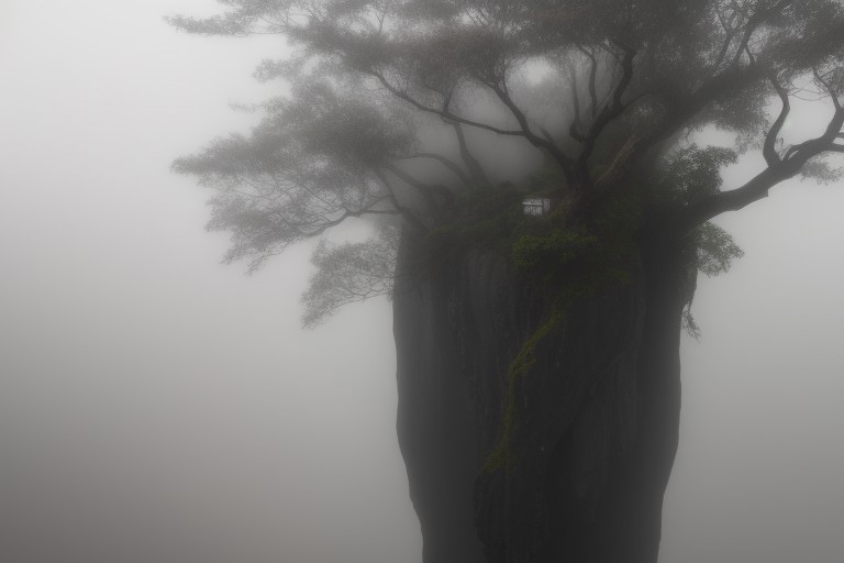 overlooking from top of cliff side, blue hanging trees, tropical blue hanging trees, looking down into a fog, fog below