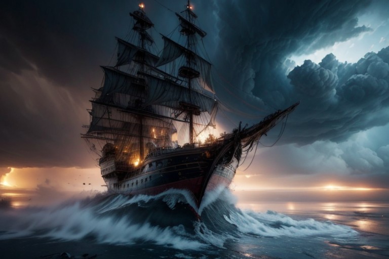 A large flying ship is sailing through the open sky. The sky is dark with storm clouds as it pushes onward. masterpiece, high quality, 8k, very detailed, intricate details, storm clouds, black clouds, thunderstorm, rain, rainfall, dynamic, durch angle, flying, flying ship, in the sky