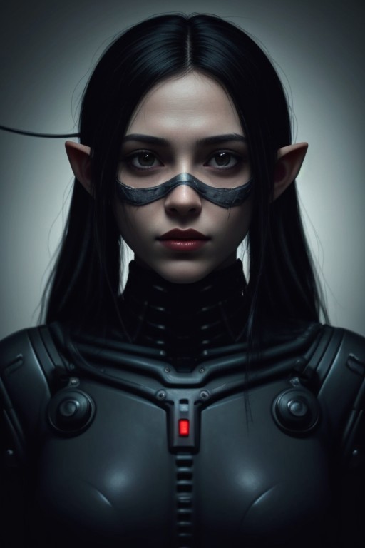 score_9, score_8_up, score_8, close up, 1girl, solo, sexy elf woman, perfect face, professional front photo of a robotic mechanical female predator from the movie "predator", predator movie mask, long black hair gathered in dreadlocks, black ratio, photorealistic, abstract dark background in cyberpunk style, amazing quality, best resolution, cybernetic augmentations, probes, cables, isometric view, depth of field, voluminetric lighting, ultra high definition, backlit, marbling, ultra sharp focus, extremely detailed, ultra high definition