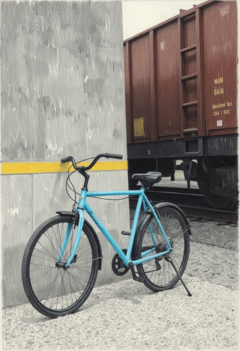 pencil sketch style of a blue bicycle is parked on a gravel surface. The bicycle is facing the viewer, its front wheel is slightly tilted to the left. The handlebars are black, and the seat is black. The frame of the bicycle is a light blue, while the tires are a darker gray. The backdrop, a gray concrete wall, is adorned with a yellow line, adding a pop of color to the scene. To the right of the frame, a brown train car can be seen.