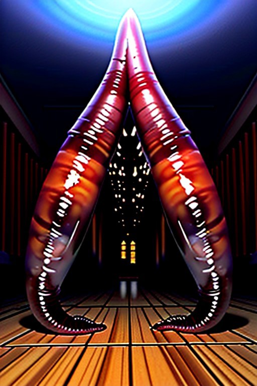 Two six-foot long massive very thick dark red erect glossy worms with swollen bases lifting straight up from the floor in a dark haunted mansion