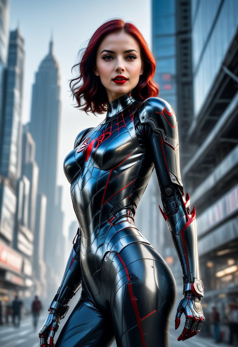 photorealistic, Ultra-HD-details, masterpiece. Vampire woman, (Marvel \Spider-Man), happy smiles, lips ajar, perfect fangs, ((carbon fiber mechanical cyborg body, full robot body)), (dynamic pose), sexy pose, (realistic:1.0), (best quality real texture skin), full body, slender hips, little shapely ass, highly detailed skin, (highly detailed face:1.0), (highly detailed eyes:1.0), (perfect anatomy:1.0), (photography:1.0), (photorealistic:1.0), in the background a large cyber city, (highres:1.0), sharp focus, daylight, (realistic, hyperrealistic:1.0), ((full Sharp)), 8k hdr