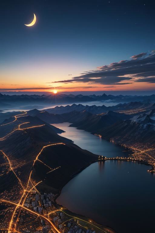 full shot,Mountains,half moon, beautiful sky, (skyscrapers), night, epic landscape, desolate atmosphere, from above, photorealistic, masterpiece, 64k, UHD, ultra detailed, vivid colors, high quality, sharp focus