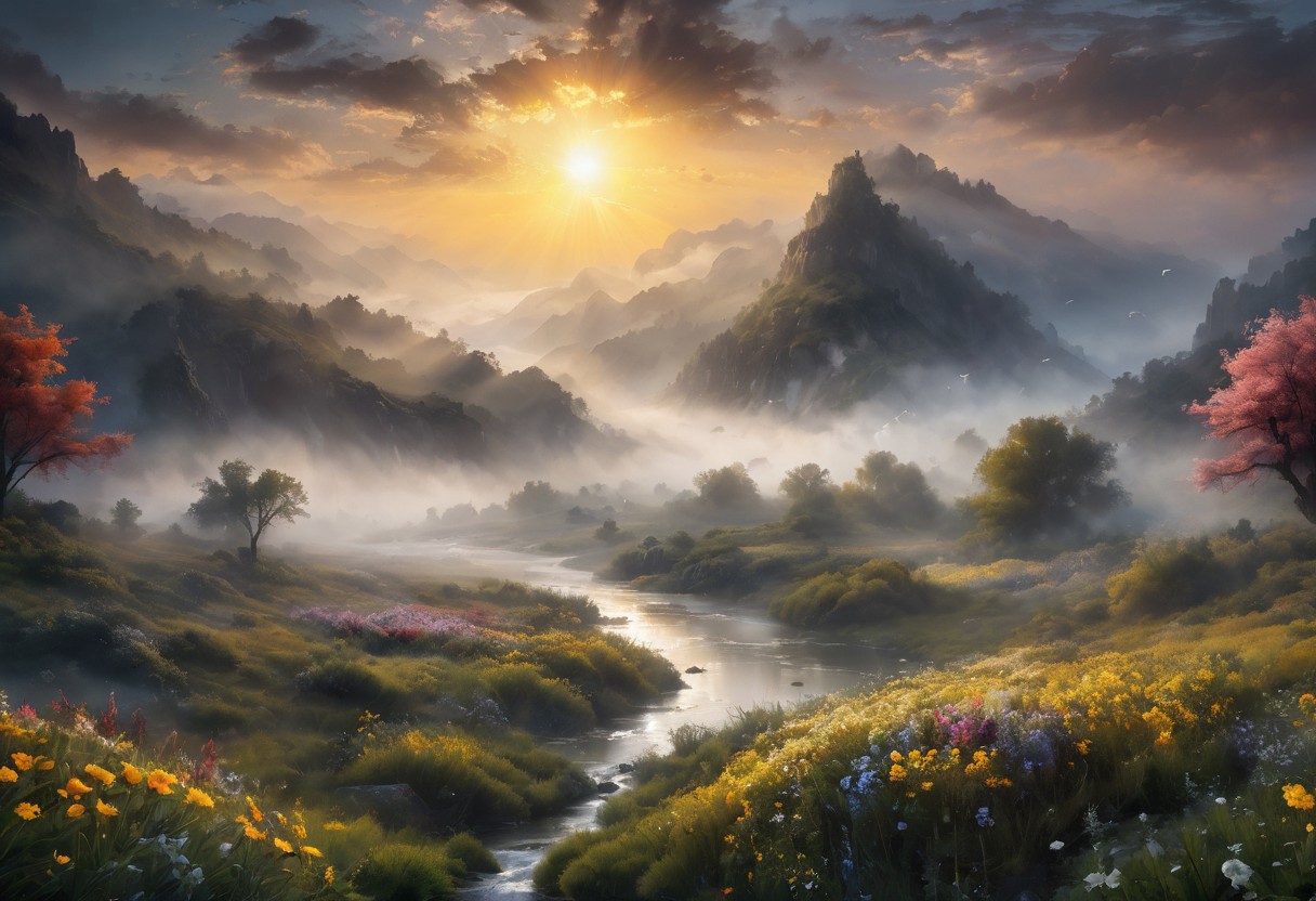 realistic photo. great, astonishing landscape. paradise. valley. sunset. fog. creek. sun rays. birds. flowers. high-resolution, highly detailed, 8k, masterpiece. score_9,score_8_up,score_7_up,score_6_up. dark