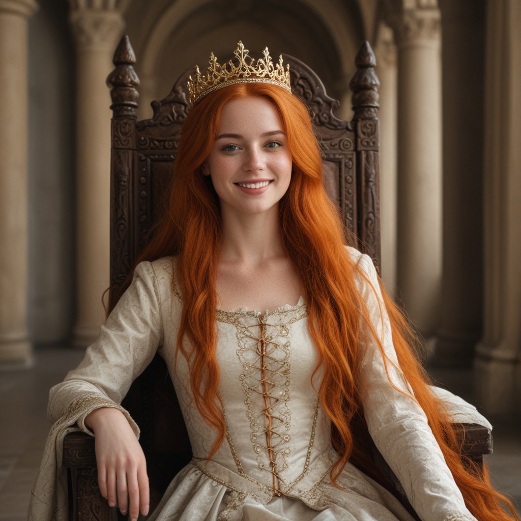 Princess, female royal, princess dress, medieval, medieval dress, orange hair, long hair, princess crown, indoors, medieval castle, palace, smile, brown eyes, beautiful face, freckles, throne