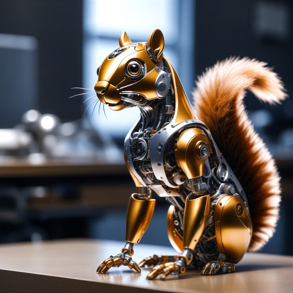 beautiful robot-squirrel, mechanical parts gleaming in the light, sitting on a desk, laboratory background, highly detailed, shiny metal, visible mechanical parts