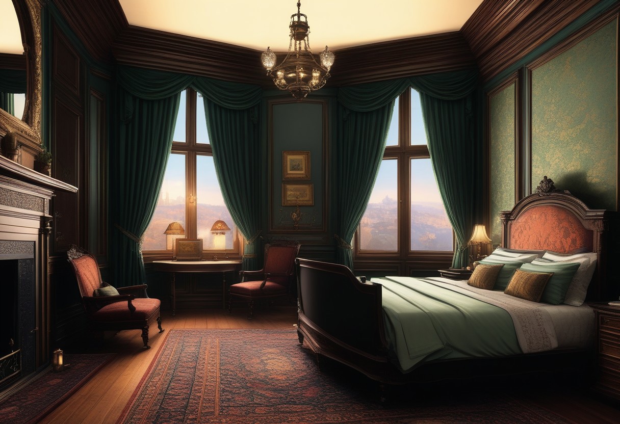 bedroom interior, no humans, curtains, window, indoors, room, scenery, door, chair, bed, hidden object games, concept art, perfect composition, award-winning photo, Visual novel game screen, digital illustration, outline, comics style, panoramic shot of reach detailed Victorian mansion bedroom. (((Dark scene, dim light from fireplace, vibrant colors, full room shot, interior focus, background focus, eye-level shot, ))) absurdres
