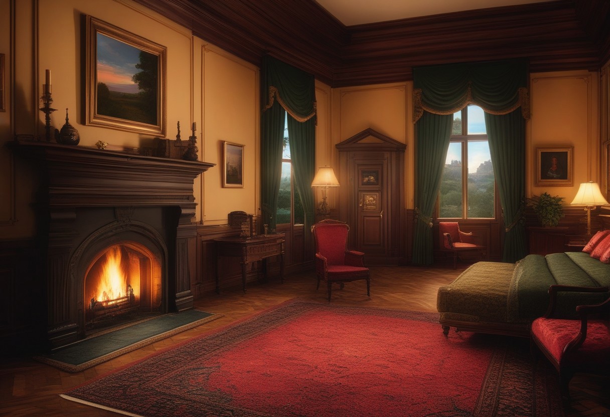 bedroom interior, no humans, curtains, window, indoors, room, scenery, door, chair, bed, hidden object games, concept art, perfect composition, award-winning photo, Visual novel game screen, digital illustration, outline, comics style, panoramic shot of reach detailed Victorian mansion bedroom. (((Dark scene, dim light from fireplace, vibrant colors, full room shot, interior focus, background focus, eye-level shot, ))) absurdres