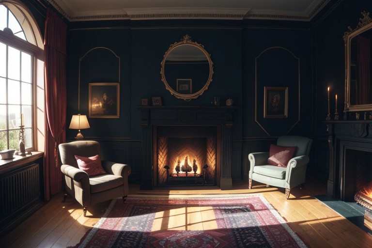 bedroom interior, no humans, curtains, window, indoors, room, scenery, door, chair, bed, hidden object games, concept art, perfect composition, award-winning photo, Visual novel game screen, panoramic shot of reach detailed Victorian mansion bedroom. (((Dark scene, dim light from fireplace, vibrant colors, full room shot, interior focus, background focus, eye-level shot, )))