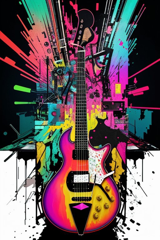 Create a striking abstract collage using vibrant cutout images of musical instruments. Blend them together in an unusual way with glitch effects.