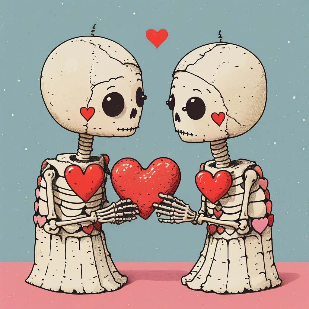 illustration style bride and groom skeleton looking lovingly at each other with love hearts