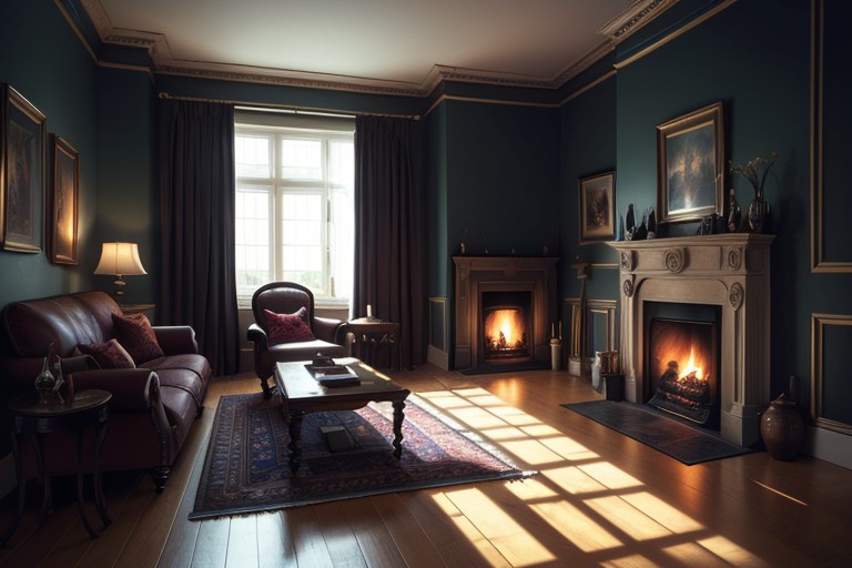 living room interior, no humans, curtains, window, indoors, girl bedroom, girly setting scenery, door, chair, hidden object games, concept art, perfect composition, award-winning photo, Visual novel game screen, panoramic shot of reach detailed Victorian mansion bedroom. (((Dark scene, dim light from fireplace, vibrant colors, full room shot, interior focus, background focus, eye-level shot, )))