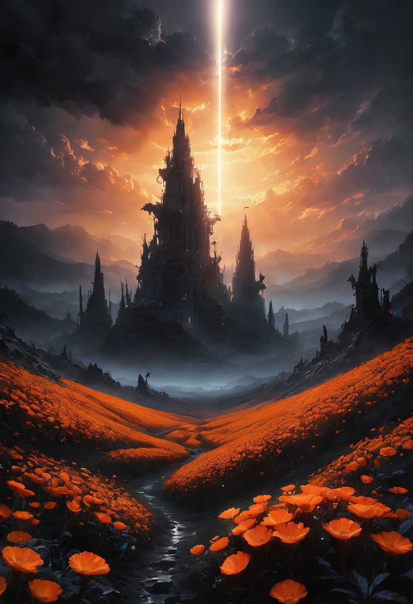 score_9, score_8, A shady world of high contrast, deep shadows, grey field of plants, bright neon orange flowers, the flowers almost glow they pop out clearly against the drab background, amazing lighting, god rays sparely hitting the field, incredible bio-luminescence, weird alien flora, bizarre plants, exceptional detail, captivating, epic sky, great background, highest quality, masterpiece, stunning interesting landscape, chiaroscuro, low-key, dark