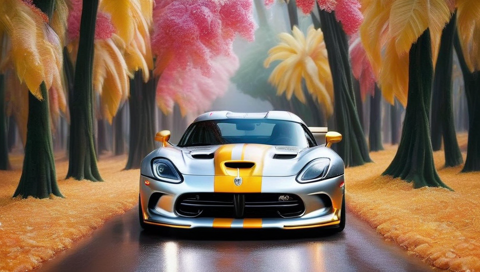 candy, a dodge viper race car on a road made of gold and silver foil, lollipop trees, gummy palm trees, rivers of melted chocolate, and jellybean flowers