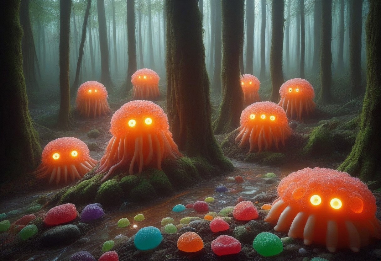 candy, monster, glowing eyes, cave, mushrooms, crystals