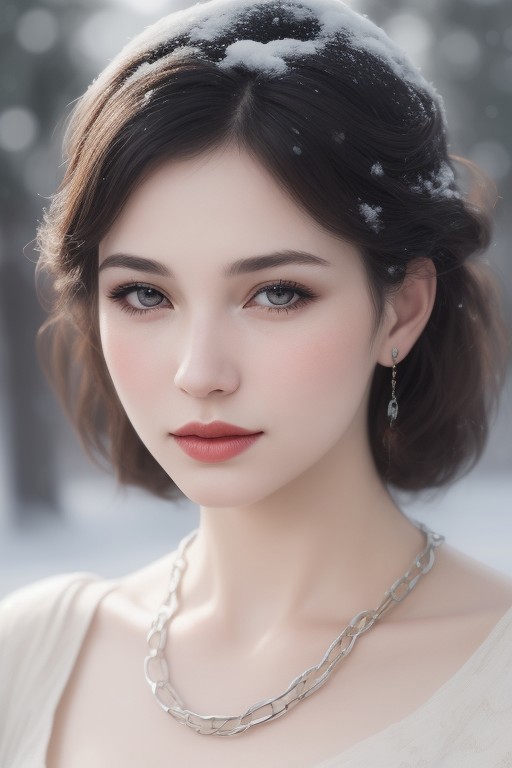simple woman's drawing, powder, parchment, snow-white bokeh, lacquer on the lips, a chain, realistic, professional photo, close-up