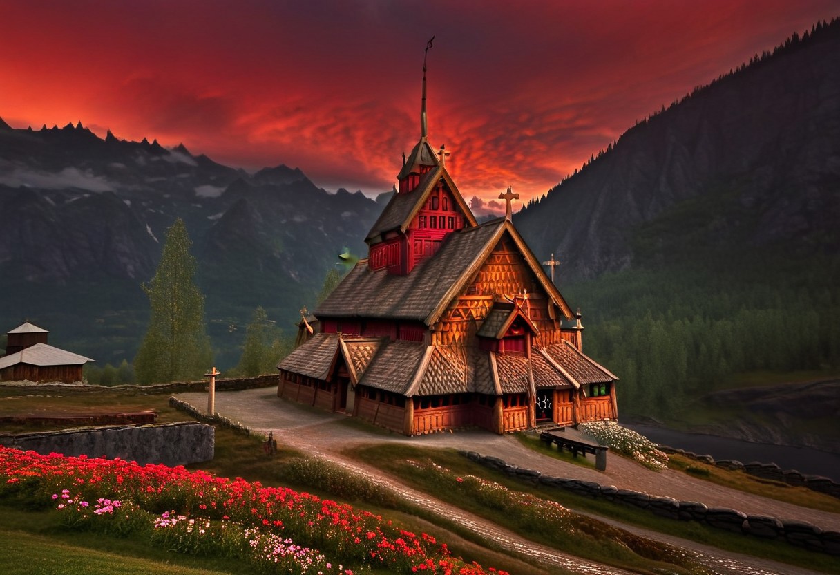 Stave church, little stave church, simple stave church, Norway, norwegian landscape, norwegian nature, forest, valley, evening, night, sunset, red sky, red clouds, stars, moon, psychedelic colors, flowers, psychedelic, beautiful scenery, beautiful view