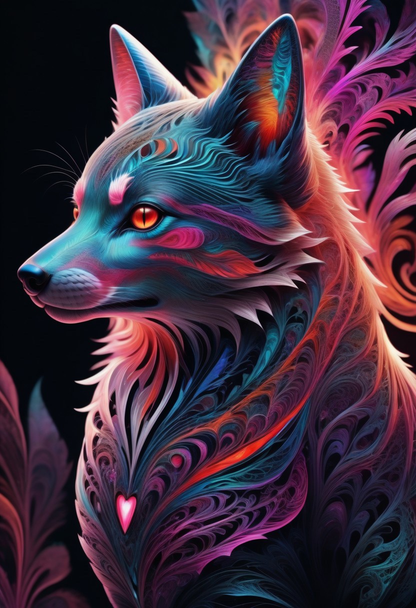 A bo-romance digital drawing reimagined in a whimsical, artistic Fractangles style. The close-up of a fox’s head and upper body is transformed with geometric fur patterns in shades of gray and black, each strand glowing with neon red fractal accents. Its striking, vivid red eyes are now intricate, kaleidoscopic fractals, radiating a mystical, otherworldly energy. The background shifts from soft pastel pink to a dynamic fractal gradient, blending neon pinks, purples, and blacks, with floating geometric shapes and swirling fractal designs. To the right, a large, 3D geometric heart glows with a delicate, flowing texture, its surface alive with shifting fractal patterns. In the foreground, a single pink flower is reimagined as a crystalline, fractal bloom, its petals glowing softly. The color palette balances muted tones with vibrant neon highlights, creating a dreamy yet surreal atmosphere. The texture is smooth and polished, with intricate shading and fractal detailing that adds depth and realism, blending romance with the infinite beauty of fractal geometry.