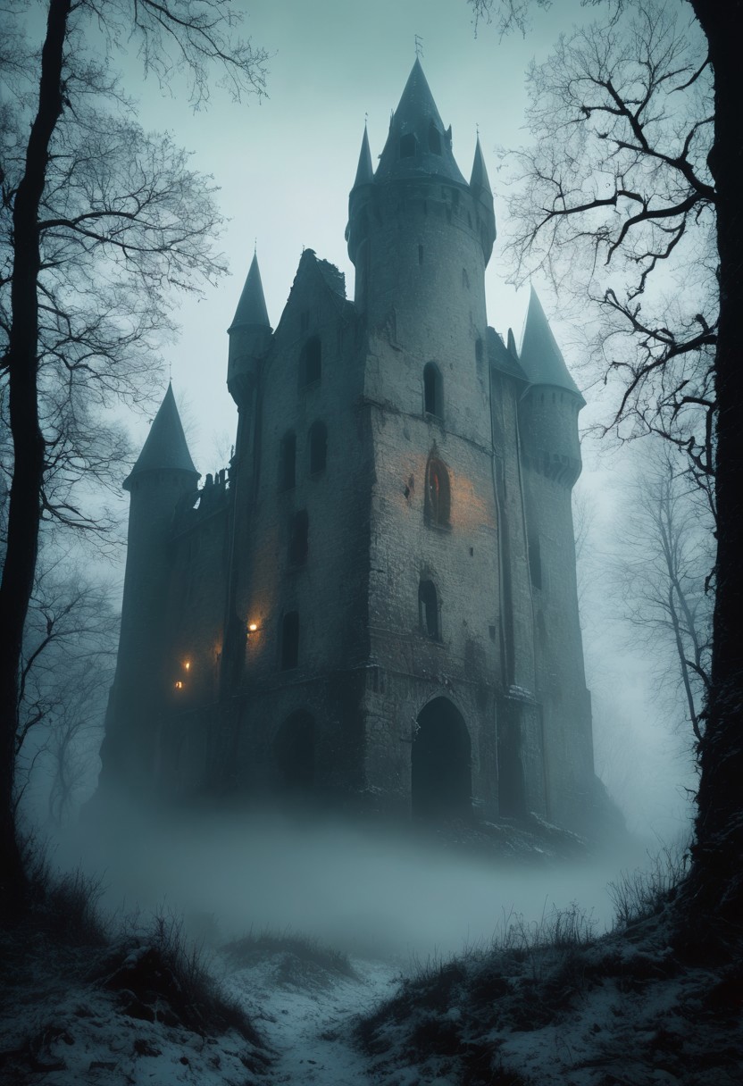 Detailed illustatuin of a victiorian horror landcsape, An old castle in a winter wood, mysterious supernatural fog, ruins from an ancien civilization, vibrant colors,creepy, vintage horror atmosphere. midjourneyv6.1