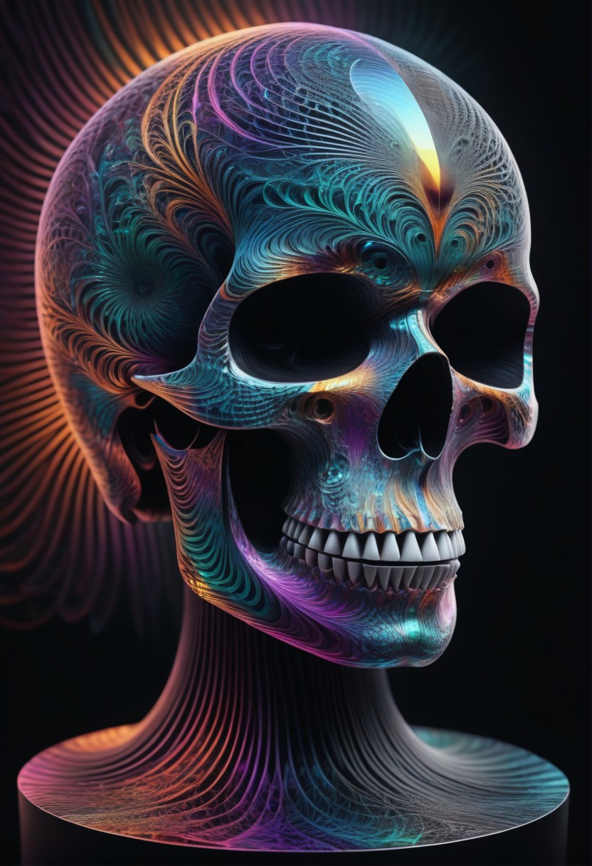 fractangles, made out of fractangles, ultra-realistic, ultra-detailed, bold outlines, skull, engravings, gem-encrusted, on a pedestal, black background