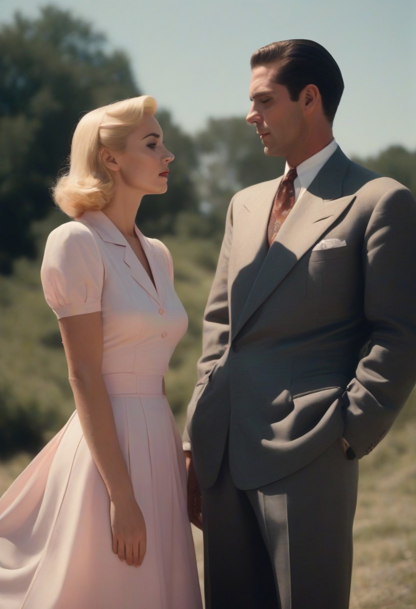 A couple , broken romance, upper body, hud_40s_lv, pastel color, 1girl, blonde hair, 1boy, closed eyes, suit, dress, film grain, cinematic, <lora:1940s_RS15:1>, outdoors, looking at another retro