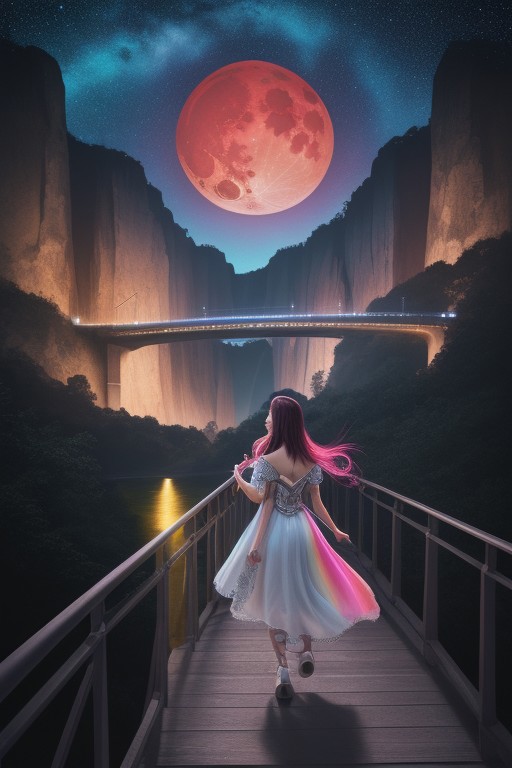 mega beautiful neon butterfly suspension bridge on the night cliff, beautiful girl walking on the bridge, rich colors, play of colors, fairy tale landscape, red moon, stardust, rainbow, macro, detail drawing, realistic, intricate details, hyper-detailed, kodak 50mm lens, professional photoshoot, full-hight scene view, intricate details, vivid colors, 50mm lens, octane rendering, professional photoshoot