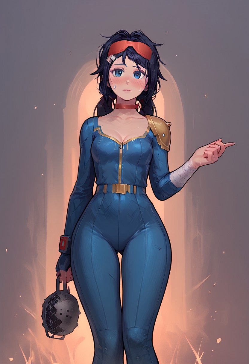 score_9, score_8_up, score_8_up:1.4, falloutpostsdxl, 1girl, Mita, low twin tails, white bandage wrapped headband, messy hair, long legs, big hips, blue eyes, blush, blunt bangs, dirt on face, long hair, collarbone, blush, solo, posing, holding a bat, stand, low angle, cleavage, fully dressed, clothed, ruined city, red fallout suit with blue trim, wearing a vault suit with leather shoulder armor and a PipBoy on her right wrist, post-apocalyptic panorama in the background,