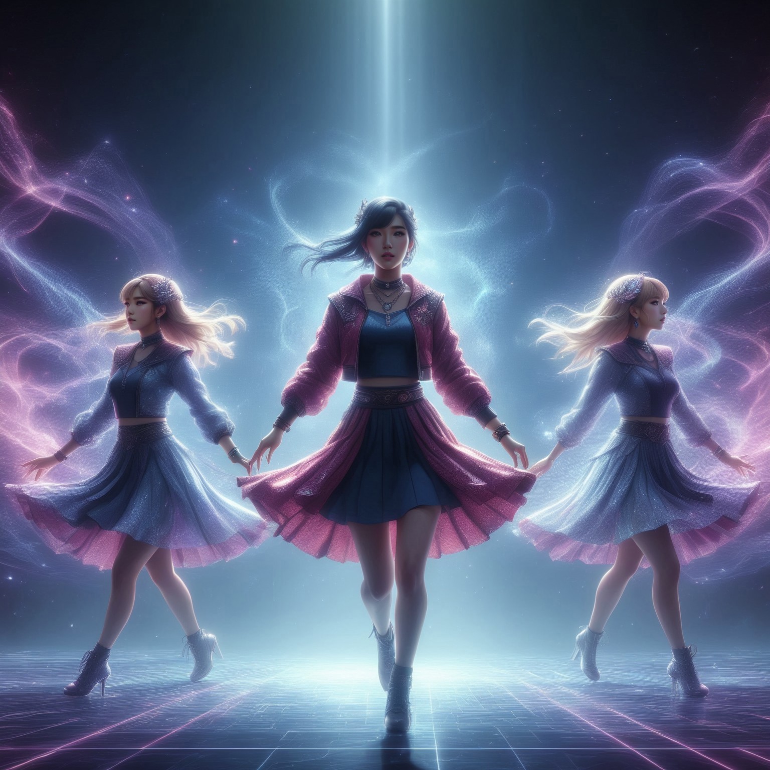 5 girls, idol group, k-pop dance, k-pop girl group, singing, dancing, braided hair, medium hair, long hair, short hair, burgundy hair, black hair, blonde hair, brown hair, asian eyes, idol outfit, high heels, mid-length dress, mid-length asymmetrical skirt, lavalier microphone, midriff top, long sleeves, jewelry, hair jewelry, glowing gentle makeup, lips, glowing effect, shining style, muted colors, spotlights, stage, high detail, high resolution, pastel colors, lots of textures, smoky effect, -- repeat 2, Cyberspace, glowing magical energy in cyberspace
