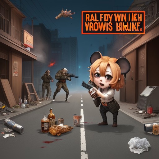 (crowd), chibi, cute, monster, food, machine, mouse, cat, war,, bullets, gun, rpg, blood, fire, waste, trash, (road background), building, beer, vodka, whiskey, scotch, blood, fight, ((((drunk)))), journal cover ry6u6uy