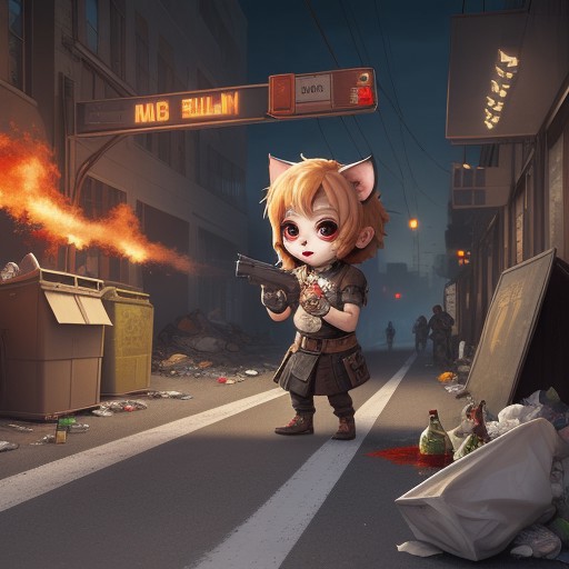 (crowd), chibi, cute, monster, food, machine, mouse, cat, war,, bullets, gun, rpg, blood, fire, waste, trash, (road background), building, beer, vodka, whiskey, scotch, blood, fight, ((((drunk)))), journal cover 676e57efy5f