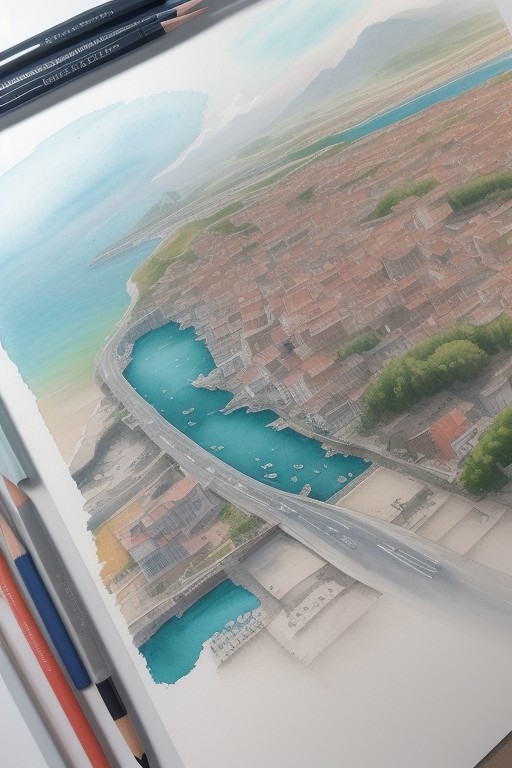 watercolor, pencils, ink, clear contours, airy, transparent, haze, abstract, pastel colors, tansu ozmen, seaside town, road to the sea, beautiful, quantum rendering, realism, hyper-detailed, colorful, natural lighting, close-up