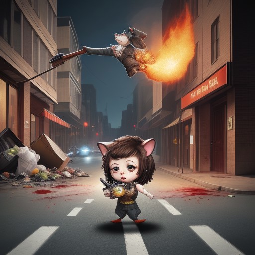(crowd), chibi, cute, monster, food, machine, mouse, cat, war,, bullets, gun, rpg, blood, fire, waste, trash, (road background), building, beer, vodka, whiskey, scotch, blood, fight, ((((drunk)))), journal cover 676e57efy5fd5rgy5dg