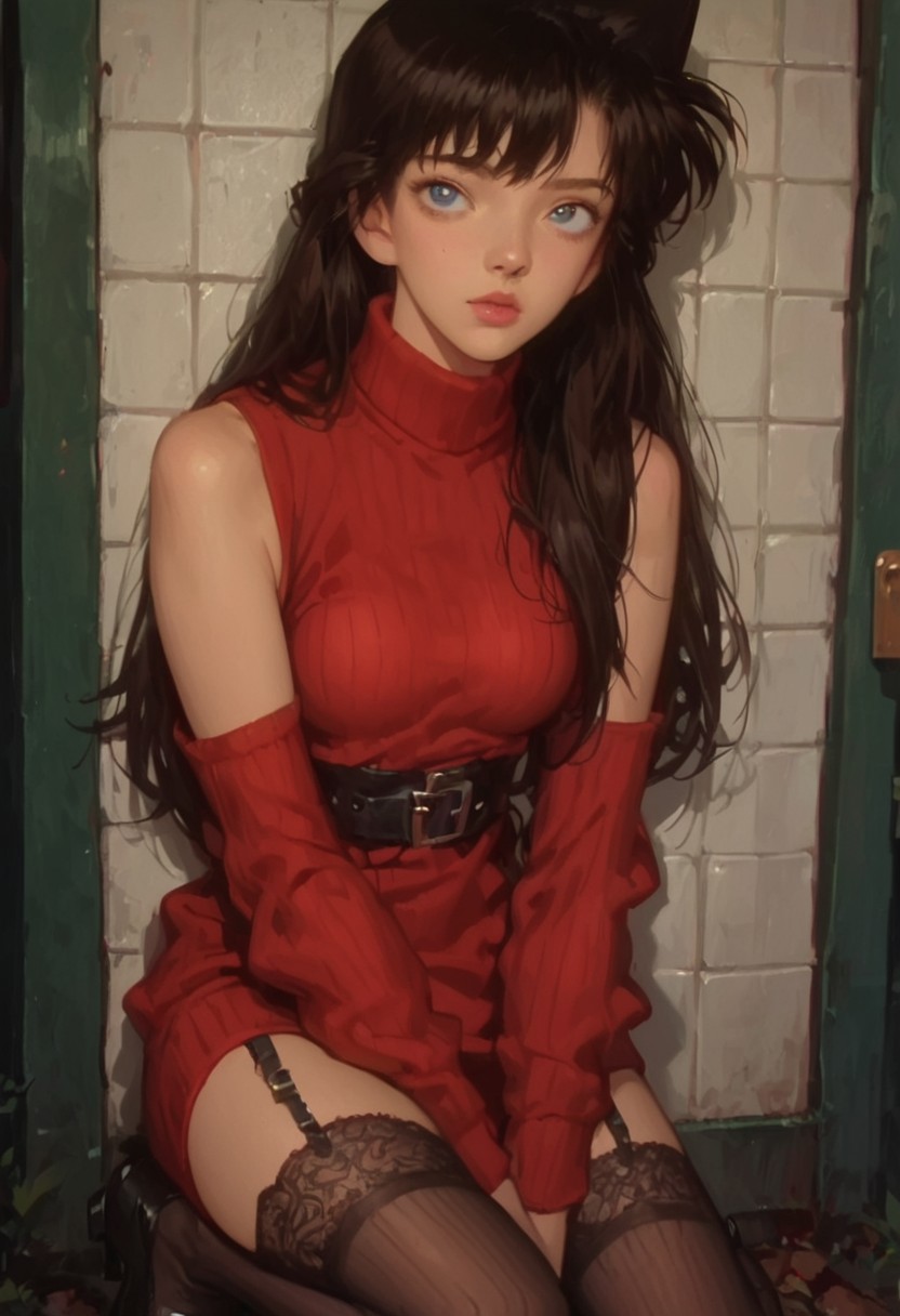 score_9, score_8_up, score_7_up, source_anime, screencap, 1girl, solo, RanMoriDCXL, 1990s (style), retro artsyle, blue eyes, brown hair, long hair, bangs, medium breasts, red sweater dress, sleevelss, sleeveless ribbed sweater dress, lace stockings, garter belt, black shoes, seductive pose, outdoors, quality, high quality, photorealistic