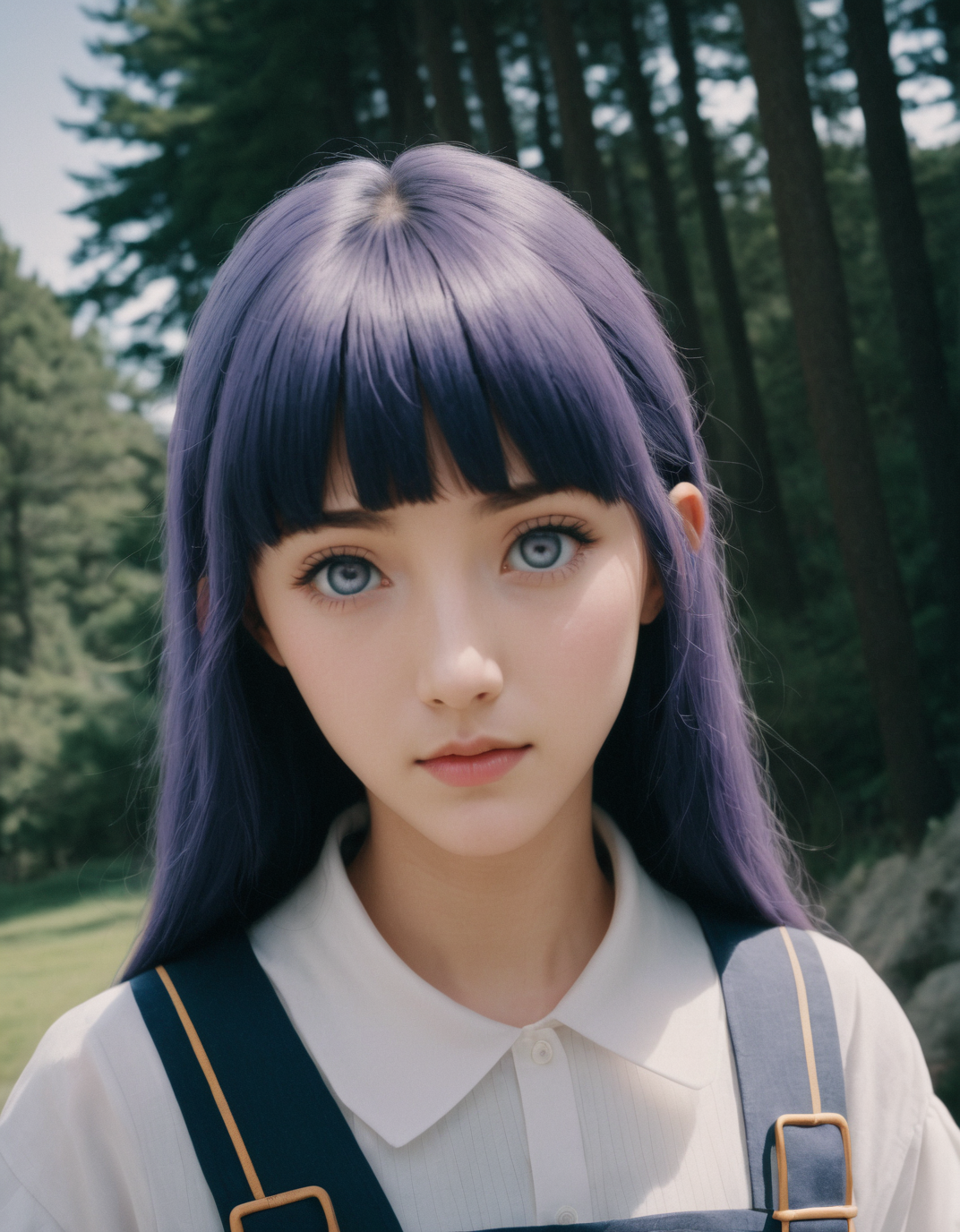Hyperrealistic art <lora:Hinata Hyuuga:1>,hhwiafu,woman,bangs,photo,1girl,pinafore_dress,, analog film photo of prompt . , film still, sharp, detailed, perfect, perfection style, Kodak, film, fujifilm, technicolor, vivid color, spotlight, amateur photography style, bright light, flash photography style, white light, over exposed style, Polaroid style,, (raven colored hair, straight hair,hime cut, bangs, very long hair:1), (Eyes, Pale lavender/white, lacking visible pupils under normal conditions:1), (Skin, Fair complexion:1), (Height, Starts as petite but grows taller:1), (Build, Slender but athletic:1). . Extremely high-resolution details, photographic, realism pushed to extreme, fine texture, incredibly lifelike