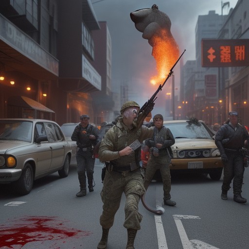 (crowd),, monster, food, machine, (((mouse))), cat, war,, bullets, gun, rpg, blood, fire, waste, trash, (road background), building, beer, vodka, whiskey, scotch, blood, fight, ((((drunk)))), journal cover, text r5gyr5g5re4e5g4e5gte