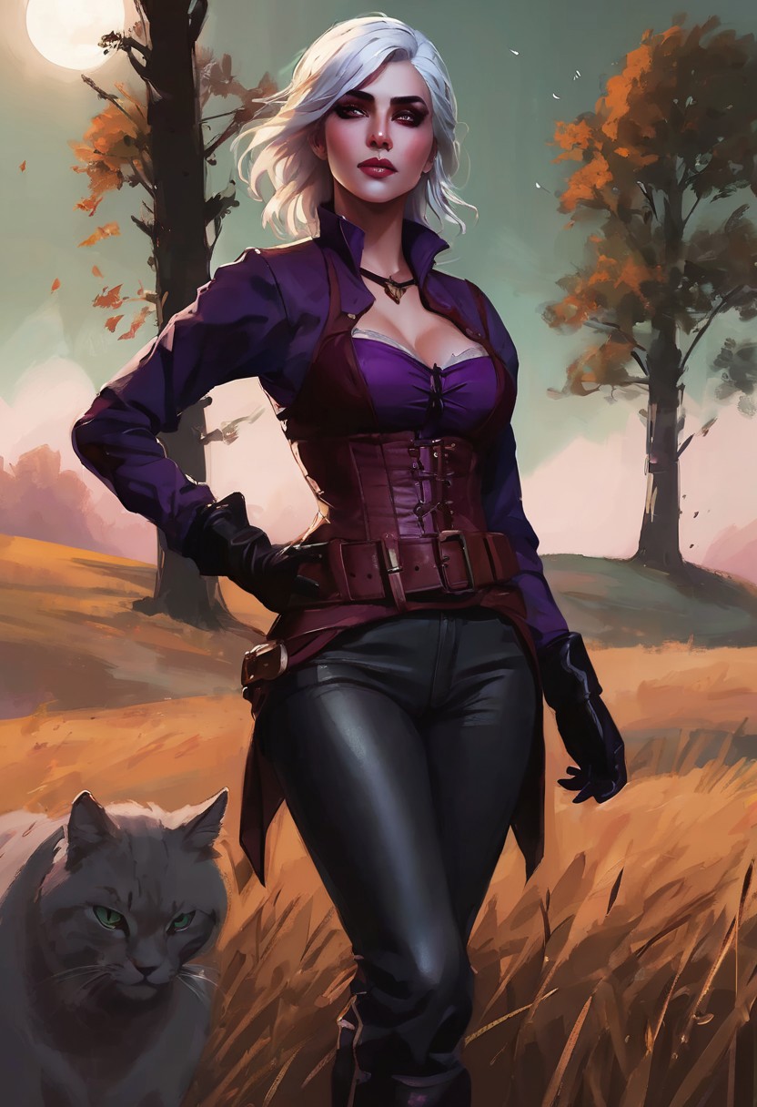 Ciri gazes directly at the viewer, her neutral expression framed by striking eyeshadow in deep aubergine. A prominent scar adds intrigue to her face. She wears a fitted forest green blouse and a leather corset cinched with a matching belt, paired with tight black pants. Leather gloves complete her look. Set against an autumn field under moonlight, the scene is rich with deep colors, enhancing her fierce yet graceful presence.
