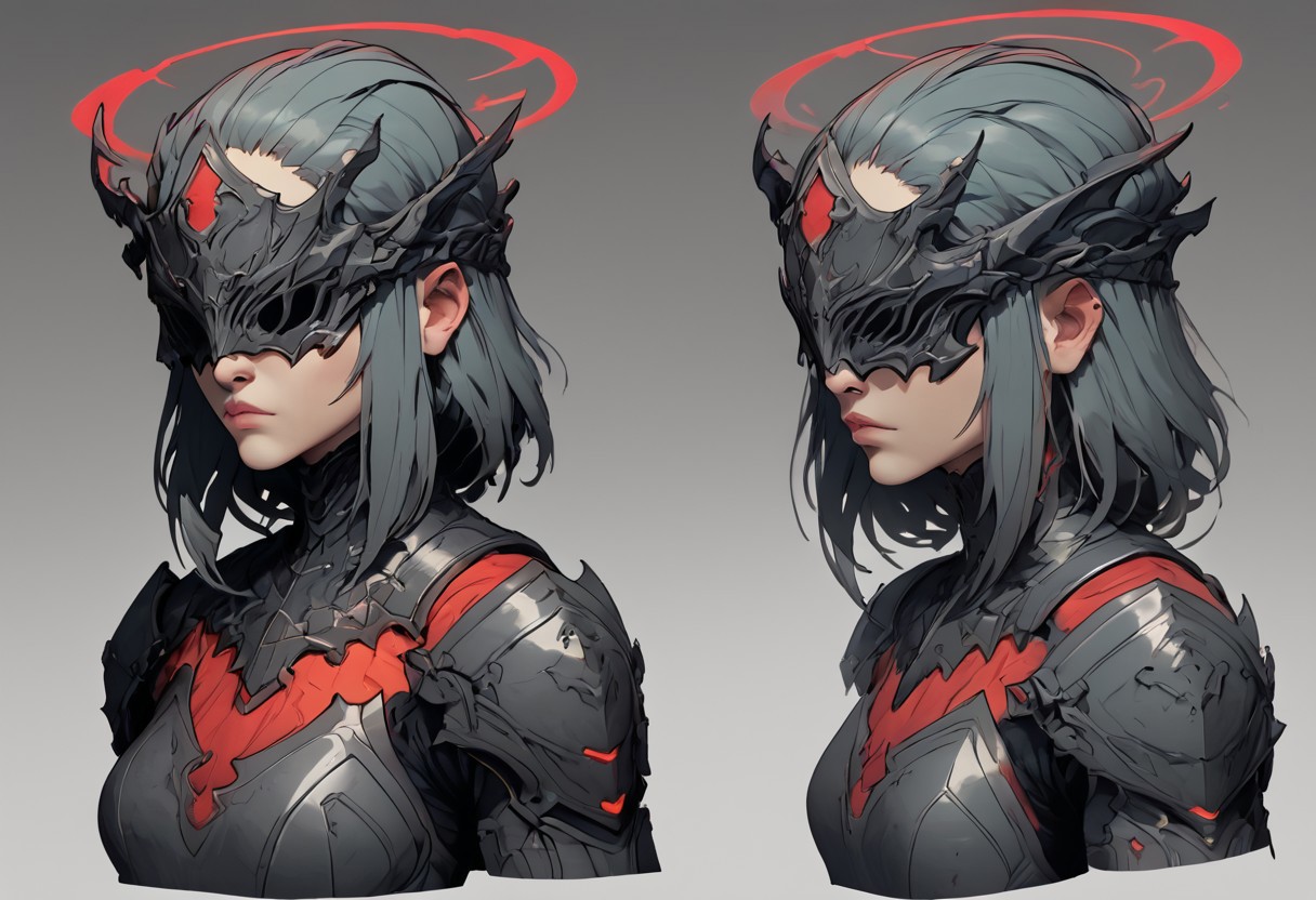score_9, score_8_up, score_7_up, blue and red contrast lighting, concept, concept art, stylized, 3d, looking at viewer, vibrant colors, beast, demon wearing death themed armor, pauldrons highly detailed , high quality , high res, mask , closed mouth, halo, detailed pauldrons, covered eyes, dramatic lighting,standing symmetrical, side view, back view, concept art,multiple views, simple grey gradient background, simple gradient background, (CharacterSheet:1), reference sheet, (portrait, bust, from side, front:1.1), upper body
