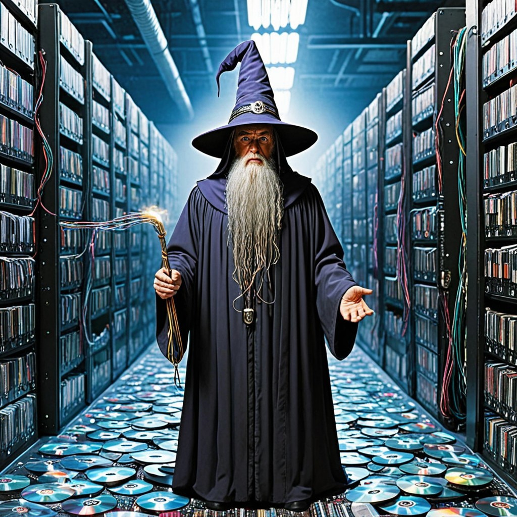Score_9, score_7_up, score_6_up, score_5_up, score_8_up, best quality, intricate detail, masterpiece, Stern and imposing Installation Wizard looms menacingly and demands termination of all running programs, surrounded by installation CDs 1man, wizard, wizard hat, wizard robes made of cd's, holding staff, scowl, serious, severe, old, perfect anatomy, looking at viewer, cyberspace, matrices, data streams, pillars of stored data, data packets floating around, floppy disks, cd, tapes, cds, digital realm, mainframe, computers, circuit boards, conduits, cyberpunk, sci-fi, perfect composition