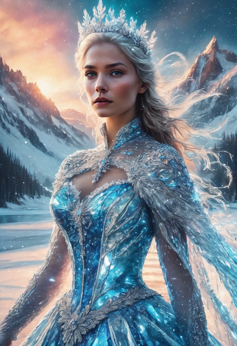 A frozen ice queen portrait of a woman in crystalline brush strokes and icy splashes, using glacier blue, frosty white, and silver, set against a glowing aurora sky,in the style of Jed-clrfl, <lora:FluxDFaeTasticDetails:0.5>, <lora:flux-colourful:0.5>, <lora:ILPonyMixv2:1>, 6-token-negative-deliberate, realisticvision-negative-embedding, epiCNegative, atompunkstylesd15, made of sparkling amethyst crystals